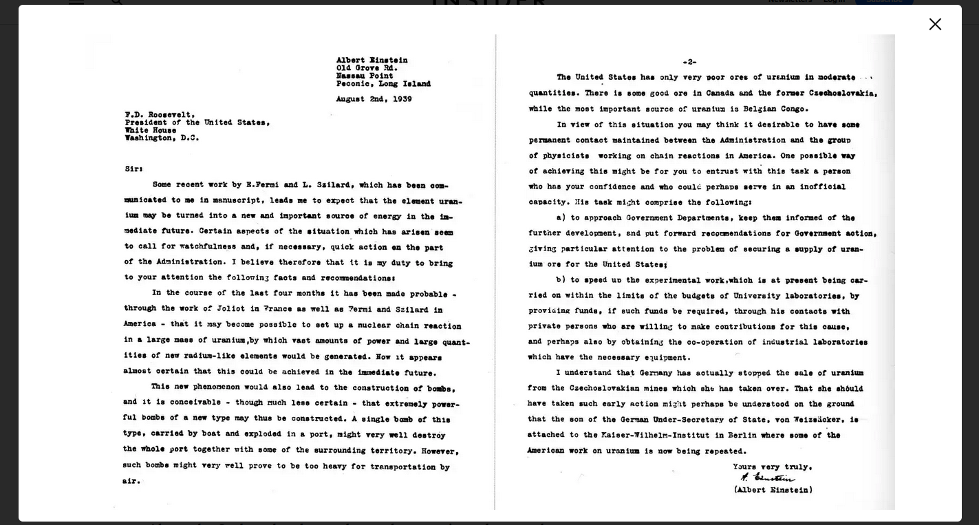 As mentioned in the (Oppenheimer (2023)) film, in 1938 a small team of German scientists managed to split a uranium atom. This split, known as fission, sees an atom's nucleus splitting into two or more nuclei which releases an incredible, explosive amount of energy. Worried that the Germans would be using this finding to build a colossal bomb, Einstein signed a letter (written by physicist Leo Szilard) to the U.S. President Franklin D. Roosevelt in 1939. The letter warned the President of Germany's potential nuclear efforts and urged him to start a nuclear program in the US. Three years later, in 1942, the Manhattan Project officially launched.